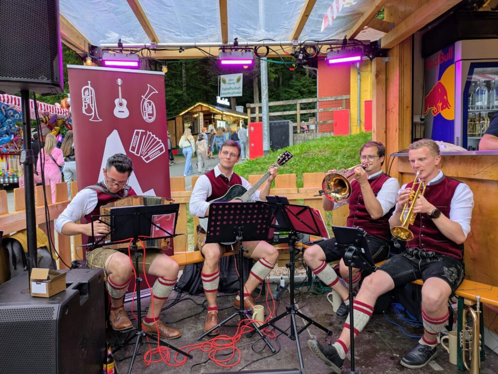Wir sind die traditionelle Musikgruppe Schiessberg4 aus dem schönen Buttenheim bei Bamberg. Mit der steirischen Harmonika, Gitarre, Tenorhorn, Flügelhorn und Gesang gestalten wir Feiern und Feste aller Art. Unser Repertoire umfasst Werke aus der traditionellen Blasmusik, Landler aus der Volksmusik, Solostücke für unsere einzelnen Instrumentengruppen und bekannte Volksmusik-Schlager.